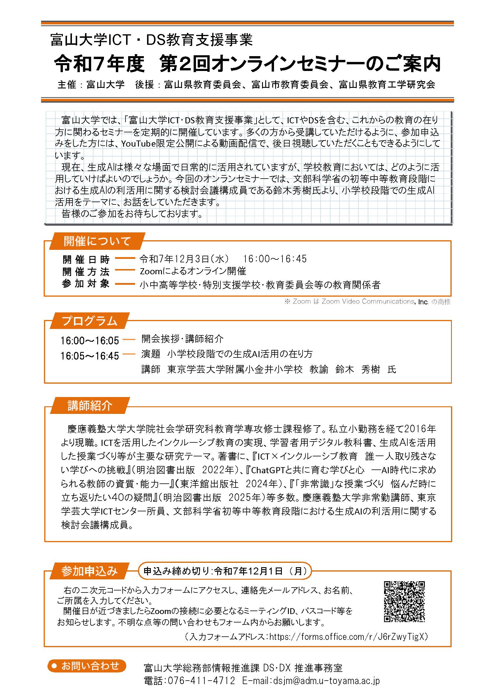 富山大学ICT・DS教育支援事業 令和7年度 第2回オンラインセミナーを開催いたします。