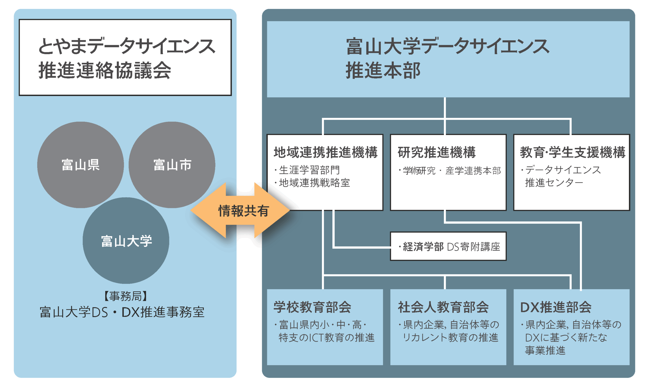 本学では,データサイエンスに関する取組により得られたノウハウを広く社会へ還元するため,富山県,富山市と協力し,データサイエンスに関する次の3つの事業を推進します。